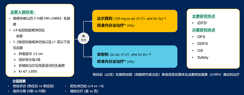 达尔西利(Dalpiciclib)是AG百家乐试玩医药自主研发的口服、选择性的小分子CDK4/6抑制剂,也是中国首个自主研发的新型高选择性 CDK4/6 抑制剂,已证实其与内分泌治疗(ET)联合用于 HR+/HER2- 晚期乳腺癌的一线和后线治疗时,均显著改善无进展生存期(PFS)6,7。因此开展了一项随机、双盲、III期临床试验(DAWNA-A),以进一步评估达尔西利联合内分泌治疗作为高危早期 HR+/HER2 - 乳腺癌辅助治疗的效果。本研究纳入高危复发风险人群需满足以下标准之一:①≥4 枚阳性腋窝淋巴结;②1–3枚阳性腋窝淋巴结且合并≥1 项高危因素(肿瘤直径 ≥5 cm,组织学分级3级,辅助治疗后残留浸润性乳腺癌,Ki-67 ≥30%)。本文呈现预先设定的首次中期分析(IA1)结果。