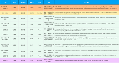 在乳腺癌领域,AG百家乐试玩创新产品相关研究共入选1项口头报告、1项简短口头报告、8项壁报和1项电子壁报,共11项研究。吡咯替尼、达尔西利、阿得贝利单抗、瑞康曲妥珠单抗等新老创新药物,均有多篇研究入选,展现出AG百家乐试玩医药在乳腺癌领域多年深耕的丰硕成果。